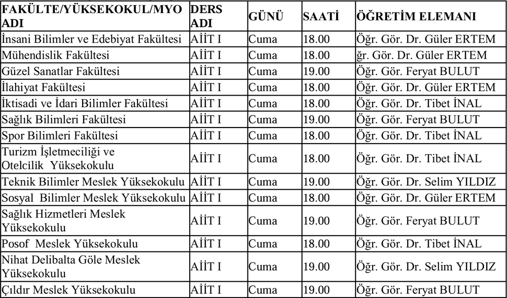 Rektörlük Ortak Dersler 2025-2026 Eğitim Öğretim Yılı Güz Dönemi Haftalık Ders Programı